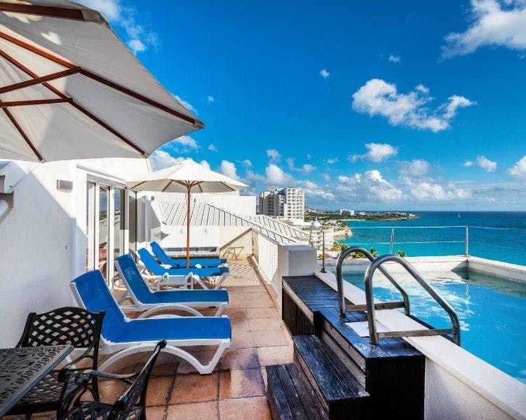 Featuring two bedrooms with one king bed and a full sofa bed that can accommodate up to six persons. Ranged from 180m² to 245m² / 1938 sq ft to 2637 sq ft, the two Bedroom Penthouse has a living area, two bathrooms with Italian marble and tile flooring and views of the Caribbean Sea and Simpson Bay Lagoon from a private terrace & balcony.