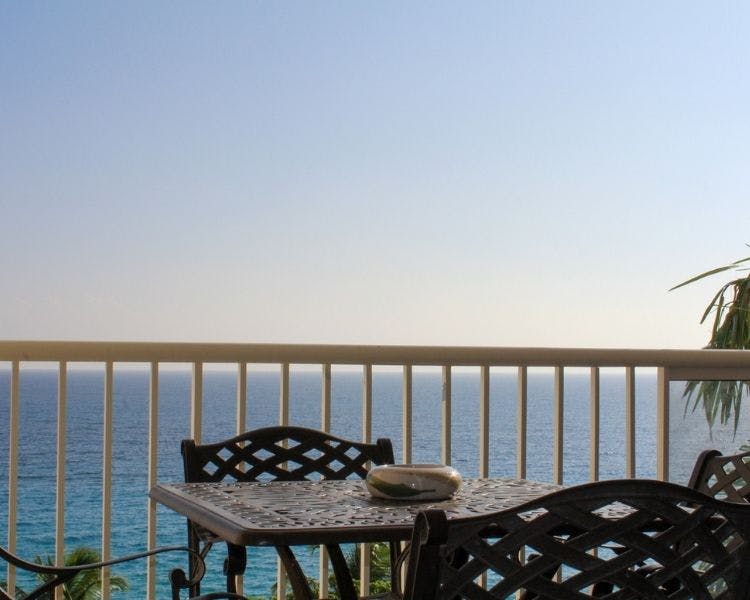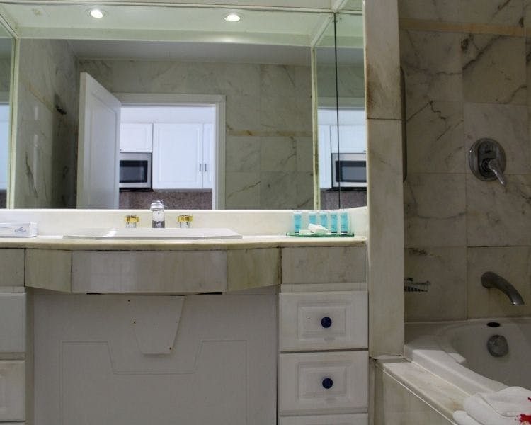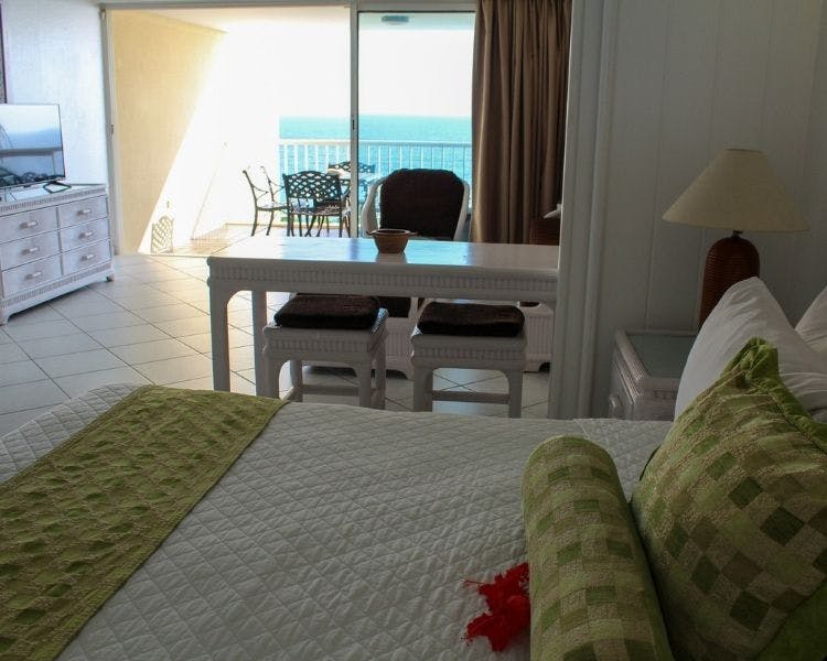 Disfrute de esta habitación de 66 m² con vistas al mar con una cama king size y un sofá cama separados con una puerta corredera de madera para mayor privacidad. También cuenta con un salón, un baño con suelos de mármol y baldosas italiano y una terraza privada con vistas al mar Caribe.