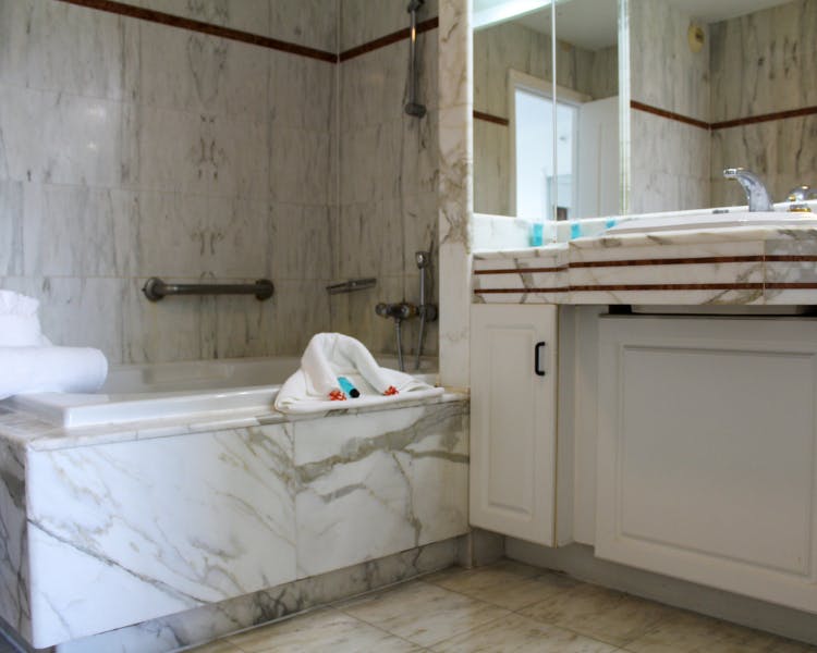 Italian marble and tile flooring in the bathroom with shower add the ambiance to this 89m² / 958 sq ft One Bedroom Suite Caribbean Sea with a king bed and a sofa bed in the living area that can accommodate up to four persons
